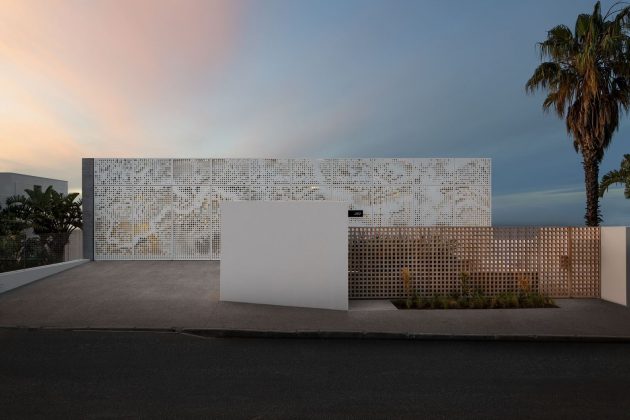 A more delicate, double-skinned screen – with integrated garage panels – is suspended over the entry forecourt and provides a dynamic street façade offering privacy whilst allowing light penetration and glimpses out towards the mountain.