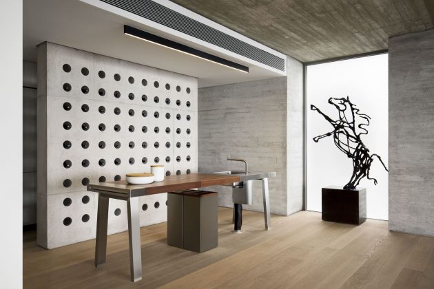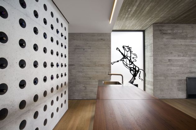 “The house was conceived as a series of horizontal slabs containing gardens, decks and pools which slide between two massy, shielding vertical elements at the flanking ends. These are constructed in planked, textured shuttered concrete and expressed internally in different ways; as a tactile and visual backdrop to bathrooms and bedrooms, for display and storage, and as elements from which to carve out fireplaces and other features. Living spaces are formed in the voids between these slabs.