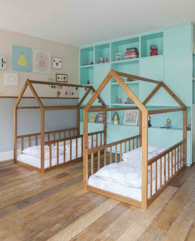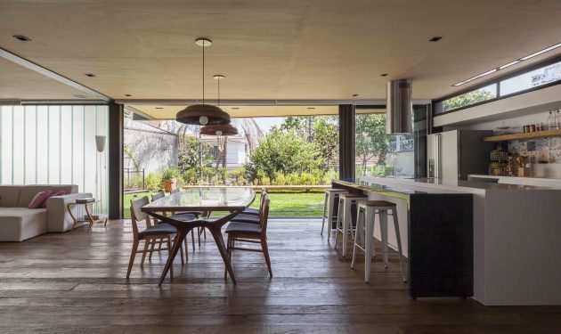 The outdoor areas have been separated into two gardens: one in the front portion of the lot, connected to the kitchen and dining area, and the larger one to the bottom that houses the pool and wooden deck, and connects to the porch and barbecue, as well as the shed, A box covered with wood that has two floors composed by the toy room and library that open to the garden, and on the same, the space for sauna and rest.