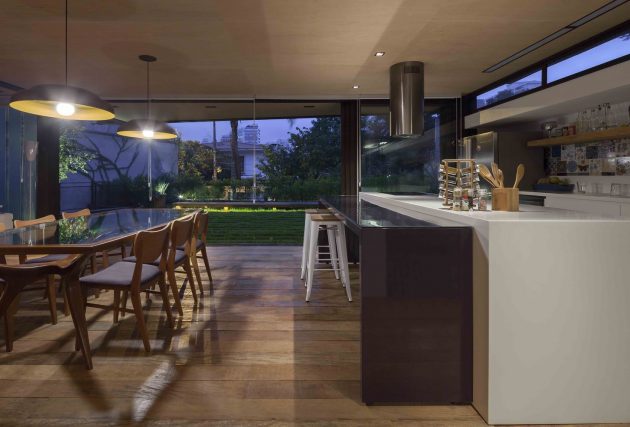 The lower floor, at street level, houses the garage for 4 cars, laundry, warehouses and technical areas. Being partially buried, this is the only concrete floor. The lighting and ventilation of these environments are made through small garden openings that houses the central heaters and a cistern buried to capture the rainwater that is reused by the automatic irrigation system of the gardens. In the upper floor, which we call ground floor, is the main living, interaction and leisure area of the family, consisting of living room, dining room, kitchen and TV room. The integration of the internal areas with the external gardens were prioritized through the adoption of glass closures around the perimeter.