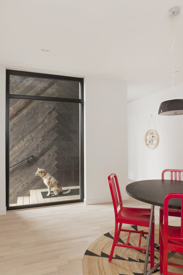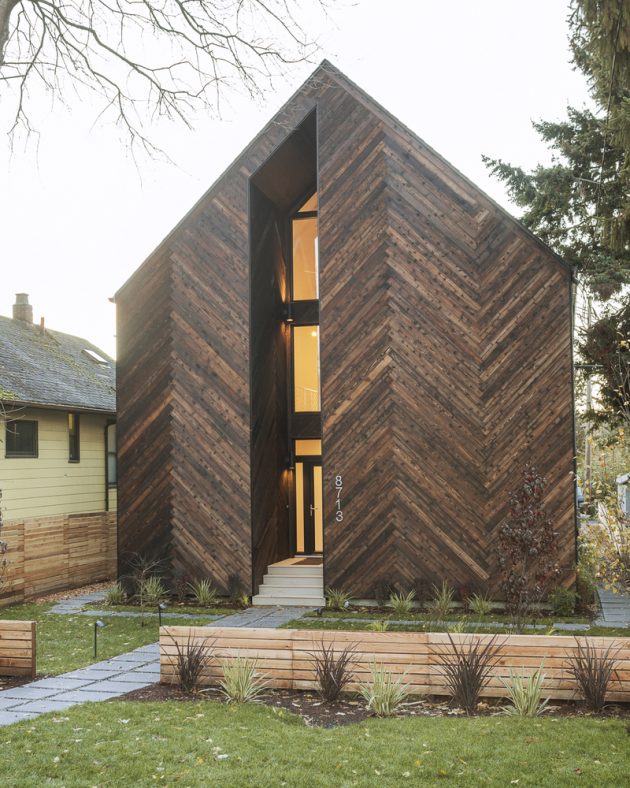 The unique façade is composed of hand-charred cedar in a herringbone pattern, adding a twist to a classic Northwest American building material. The dark patina complements the lush, tree-lined neighborhood streets, while the shou sugi ban treatment naturally seals the cedar, eliminating the need for regular maintenance in a rainy Seattle climate. Once inside, the large windows and white, minimal interior maximize natural daylight to create a light filled space that is private from the street.