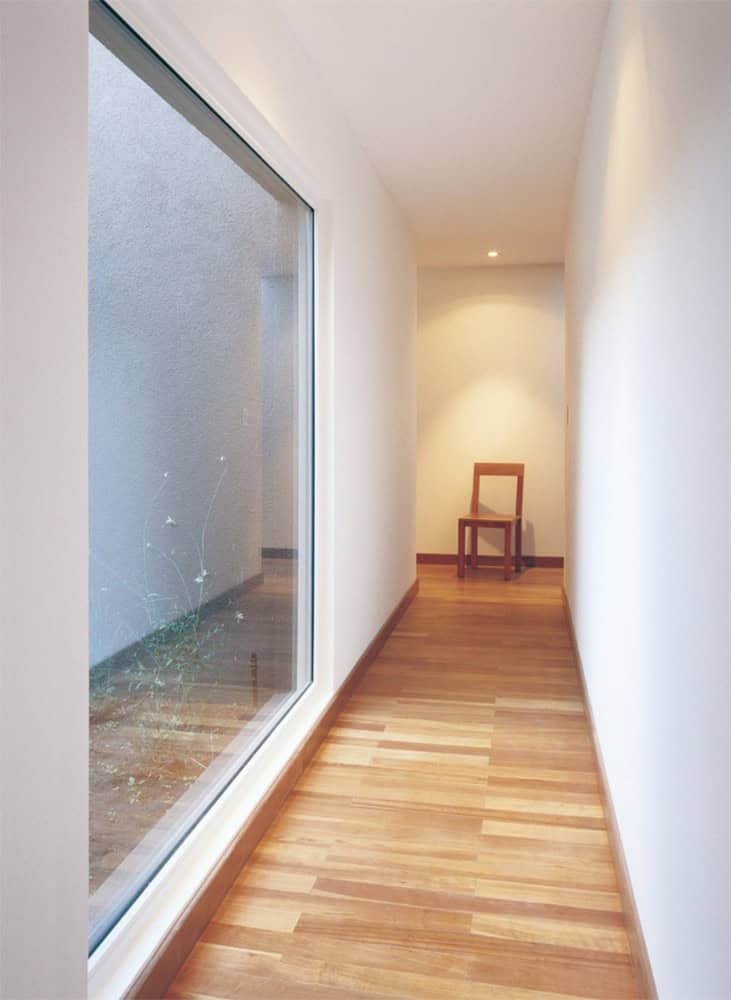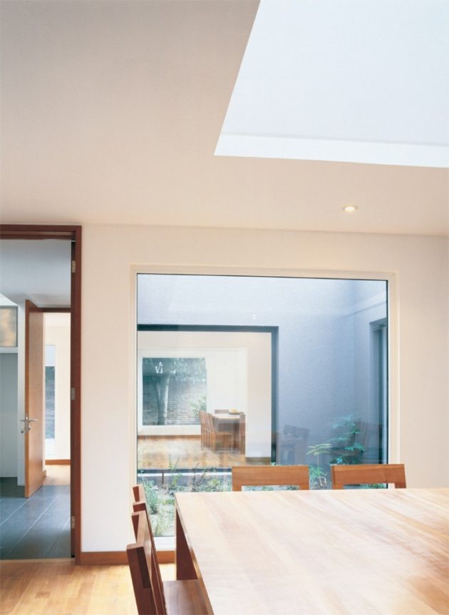 The irregular structure, somewhat labyrinthic, together with establishing a series of variations responding to the size and proximity among rooms, contains nine patios open to the sky. Something similar to nine openings that control the density of the plan. The floor has no variation of levels. If the roominess of some spaces was made possible by elevating the ceilings to the equivalent of two floors, this decision couldn’t affect the patios by casting a shade over them. We therefore established two inclinations: that of the roofs, that always descends towards the patios (allowing only the shade casted by the vertical walls); and that of the ceilings, whose vertex sliced by natural light openings is located depending on the furniture of each room.