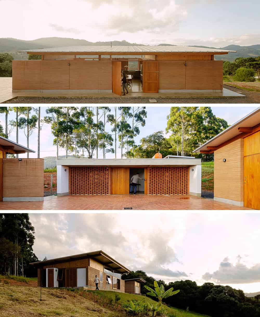 The main and guest houses feature glued laminated wood roofs with insulation panels and 30 cm thick rammed earth walls for efficient climate control. The shed, serving as a utility and tool space, adopts a simpler palette of exposed concrete, ceramic brick cobogós, and panel slabs, reflecting a hierarchy of purpose and cost efficiency.