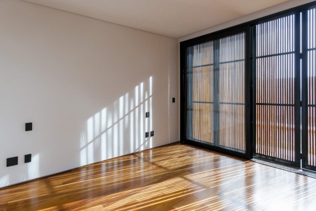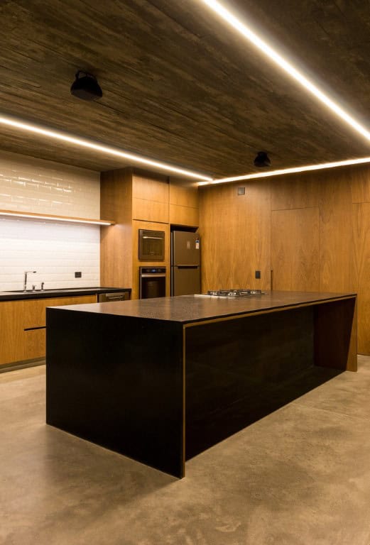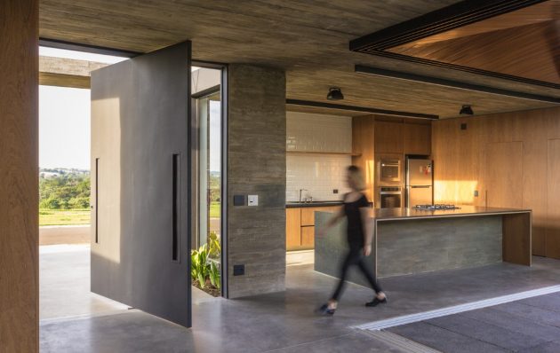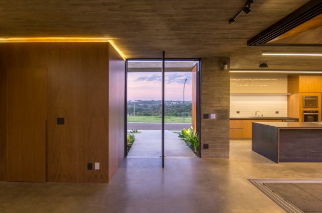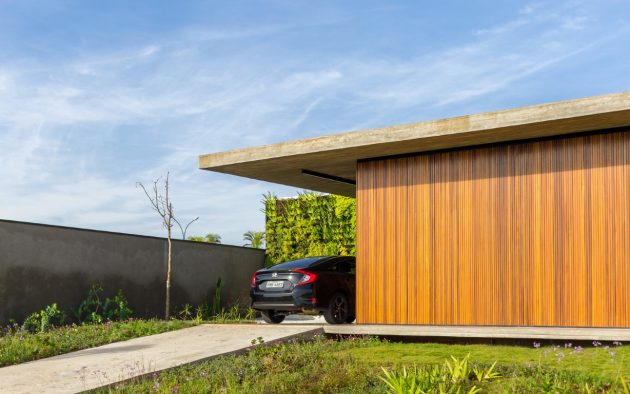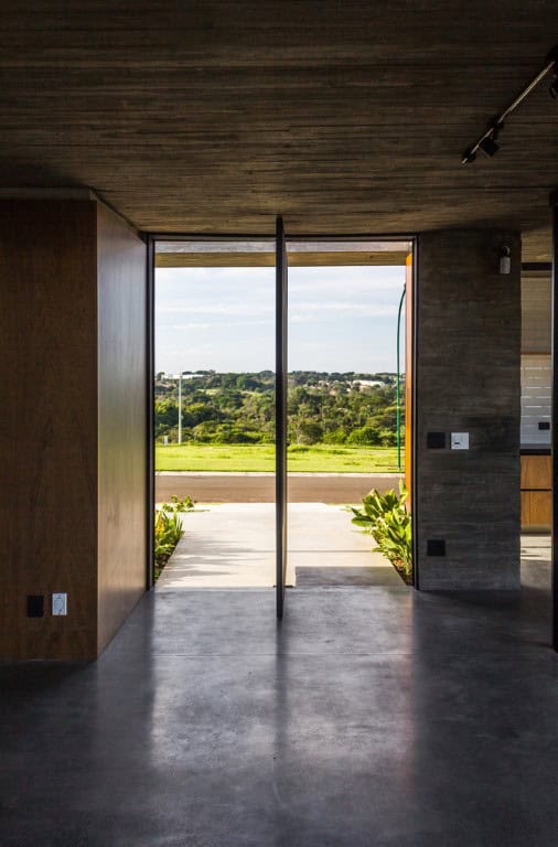 The board-formed concrete is sovereign on the residence. Made in an experimental way by the construction team, the client approved the quality of a wall prototype made in the beginning of the construction, being adopted later as coating for the whole house: walls, ceiling, flooring, all elements apparent and definitive. Once the mold was removed, only the treatment of the material by a specialized team remained. It does not require maintenance, painting, gypsum ceiling, roughcast, plaster, nothing. It is ready as soon as it is unmold.