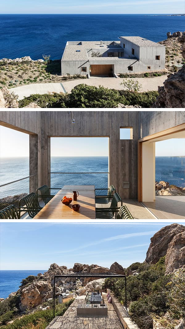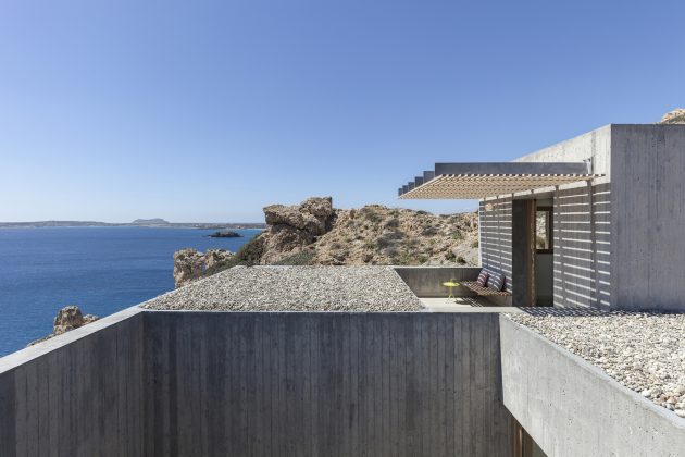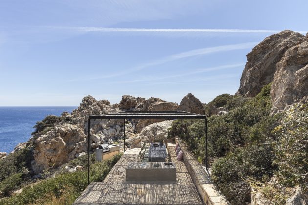 The Patio House is placed on a ragged cliff side which opens up towards the beautiful bright-blue Aegean Sea. The home is blessed with breathtaking panoramic views of the sea and its layout aims to make the most out of it.