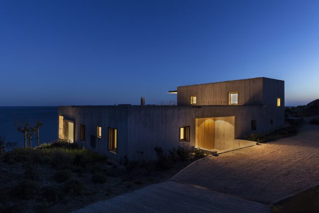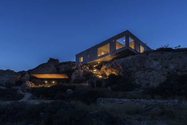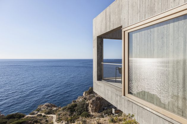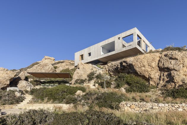 The site has two natural plateaus, one higher and one lower. In order to take full advantage of the views and reach closer to the sea, the building extends beyond the higher plateau, hovering over the landscape. This cantilever effect has a strong presence that augments the full experience of the site both from the inside and out. From the inside, it creates the illusion that the house is hovering over the sea, whilst from the exterior it further accentuates the contrast between the manmade and the natural.