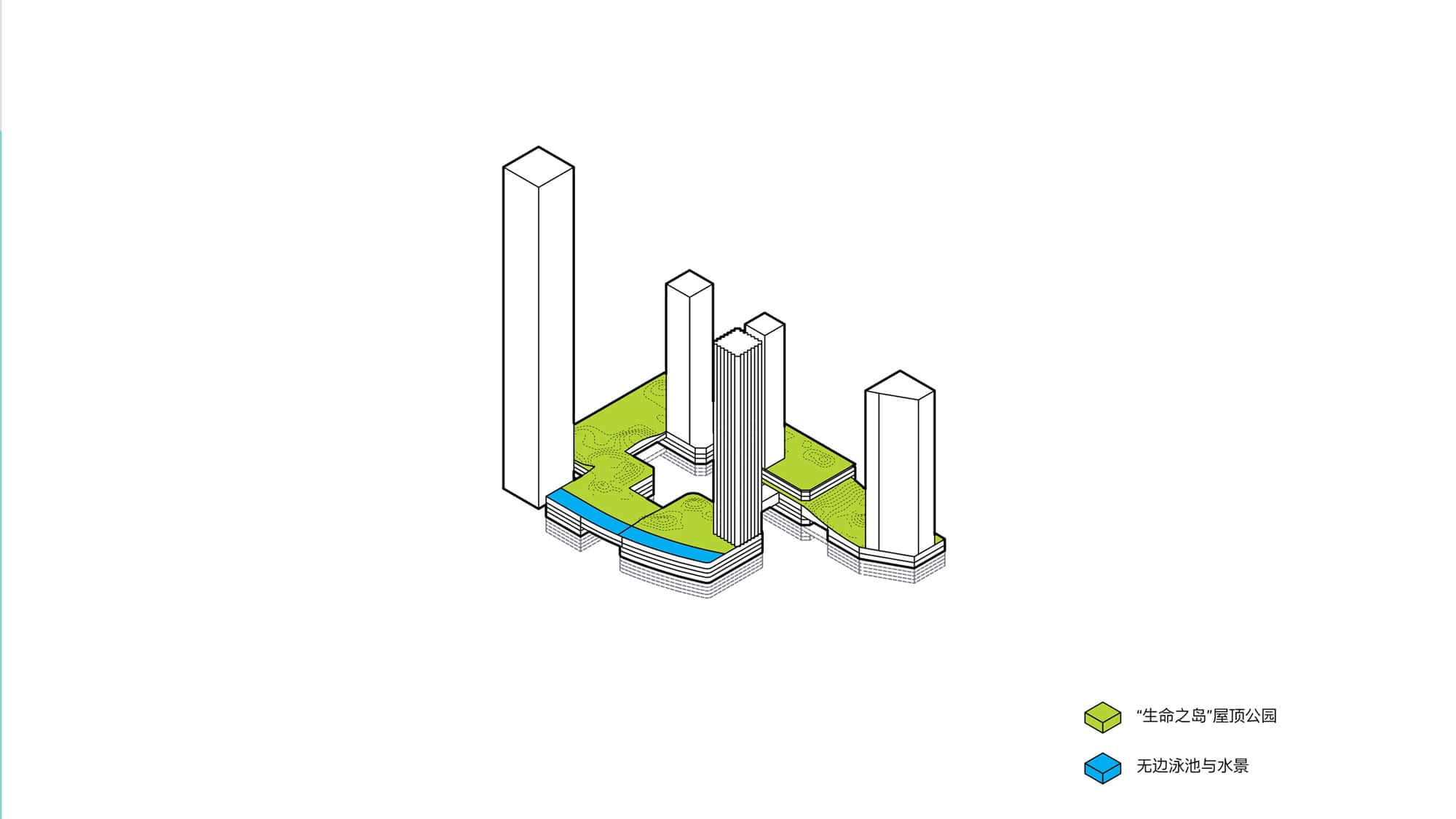 Our design strategy, centering on the unique landscape resources, aims to create an urban green island joining nearby Mountains, draw buildings closer to nature, and provide a green and healthy living environment for future owners. So our design concept is “Life Island”.