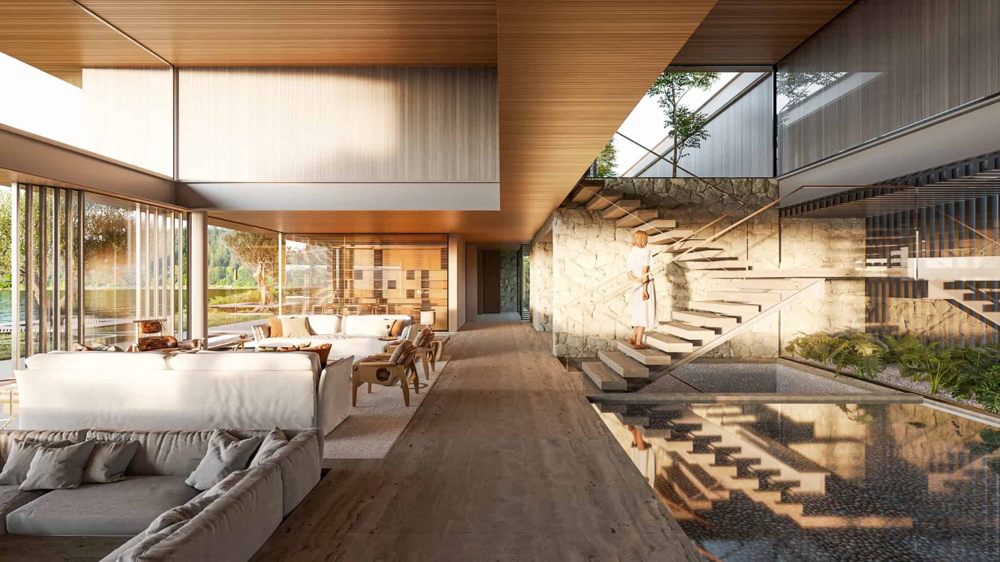 Full-height glazing and open terraces dissolve boundaries between indoor and outdoor spaces, fostering a strong connection to the environment. Natural light pours into the interiors, enhancing the peaceful ambiance throughout the home.