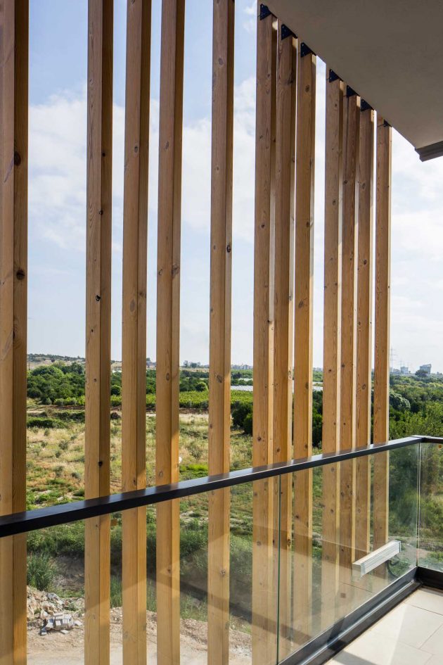 As the front façade serves for customers of shops, the office building has a segregated entrance on the back façade, facing the side road. Considering the hot climate conditions the designer has installed sun-blinds made out of wood in order to create a double façade for the building. These sun-shades help the building to resist the hot weather conditions for the workers of the office.