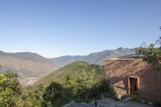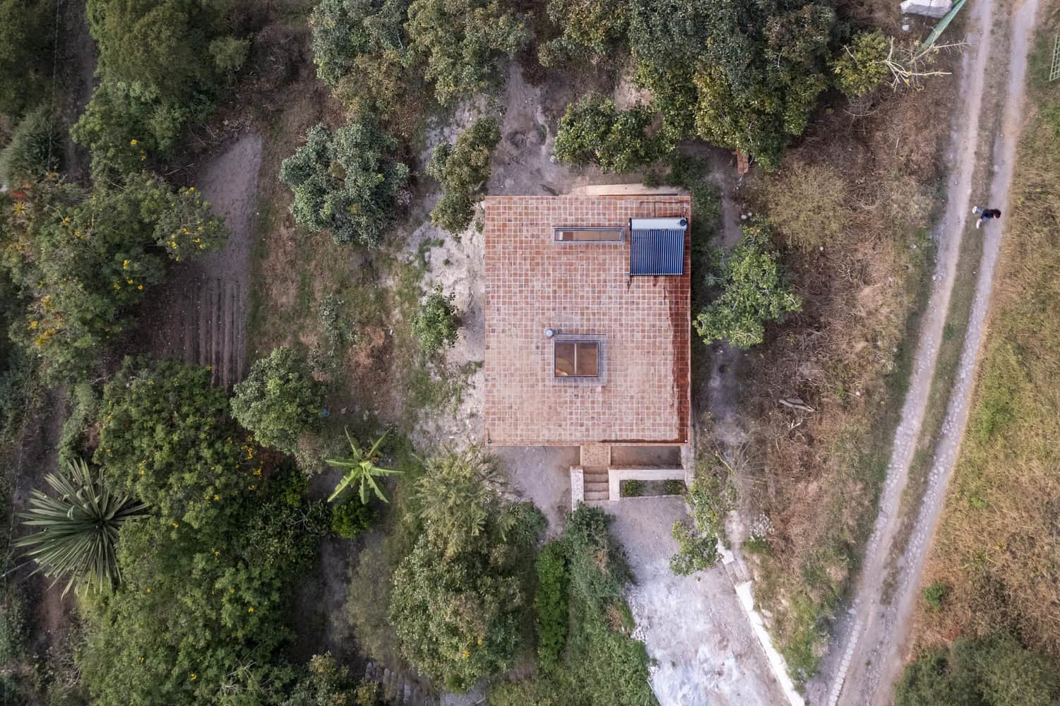 From a distance, the house reads as a sculpted volume in warm earth tones, harmonizing with the surrounding soil and vegetation. The texture of the brick tiles catches the changing light, making the building appear alive throughout the day.