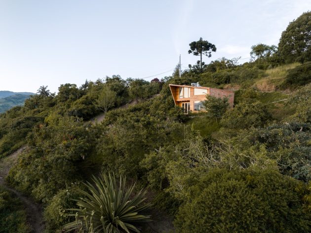 To build efficiently in a remote location, the structure was prefabricated using a solid wood frame system. This reduced construction time, minimized waste, and allowed precise detailing. The wood structure contrasts beautifully with the fired-tile exterior, creating a tactile balance between warmth and permanence.