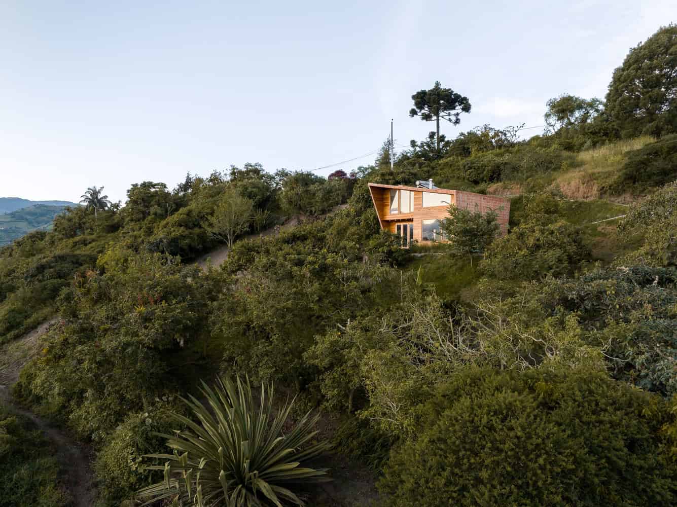 Contemporary wooden house on hillside with modern architecture, large windows, and natural surroundings, showcasing innovative design and integration with nature.