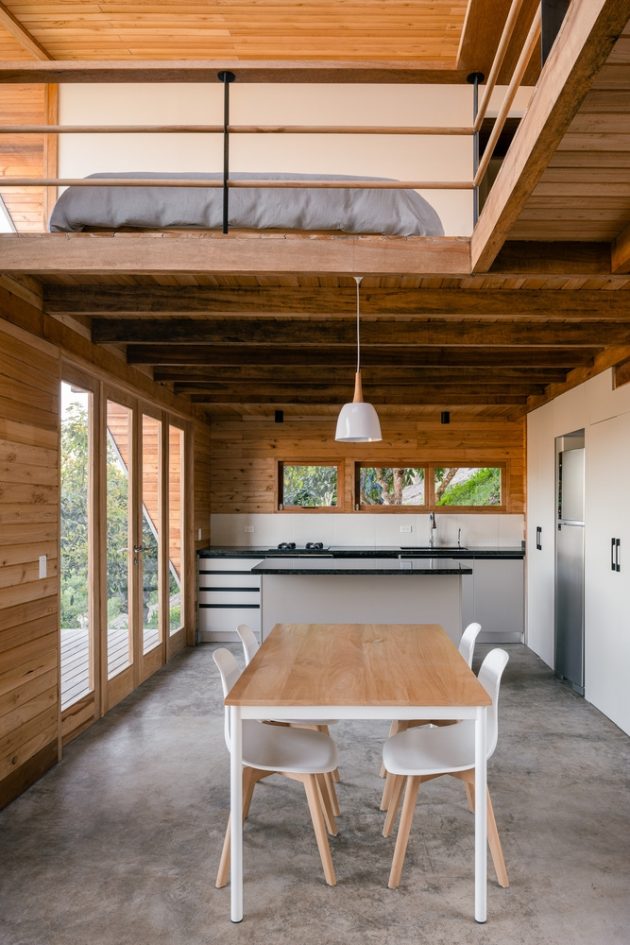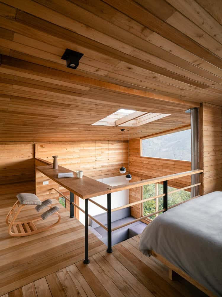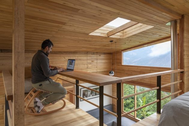 • The upper floor holds private areas: a bedroom, workspace, and guest zone. Despite the compact footprint, the visual openness and strategic placement of openings give each room a generous sense of space.