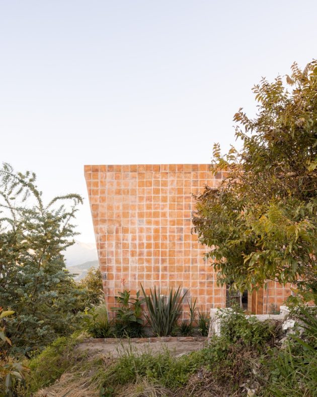 The most striking feature of Perucho House is its continuous terracotta skin — a mantle of fired tile that wraps around walls and roof as a single surface. This unbroken envelope performs multiple roles: it acts as structure, protection, and identity.