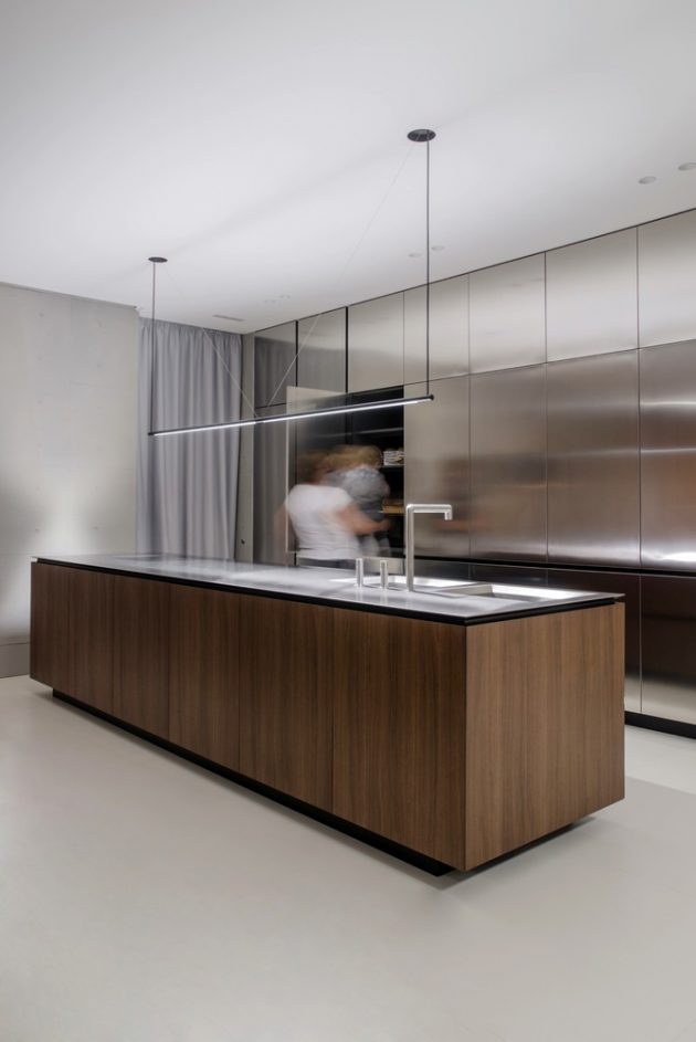 The shape of the building was dictated by the surrounding low-rise buildings. Its plan is formed with an inner courtyard with a swimming pool next to which is the pavilion.