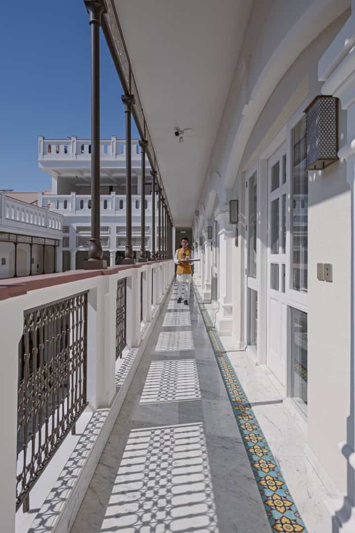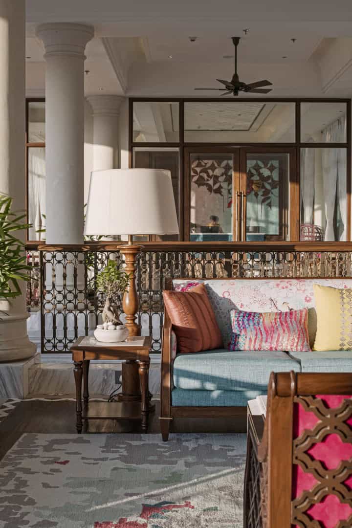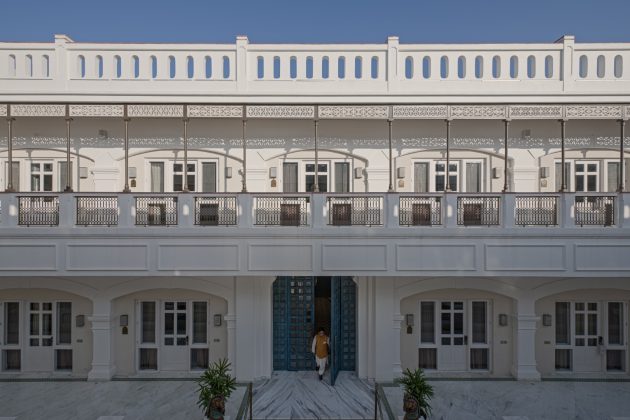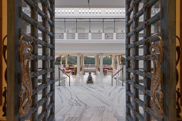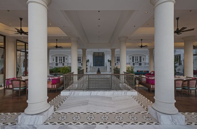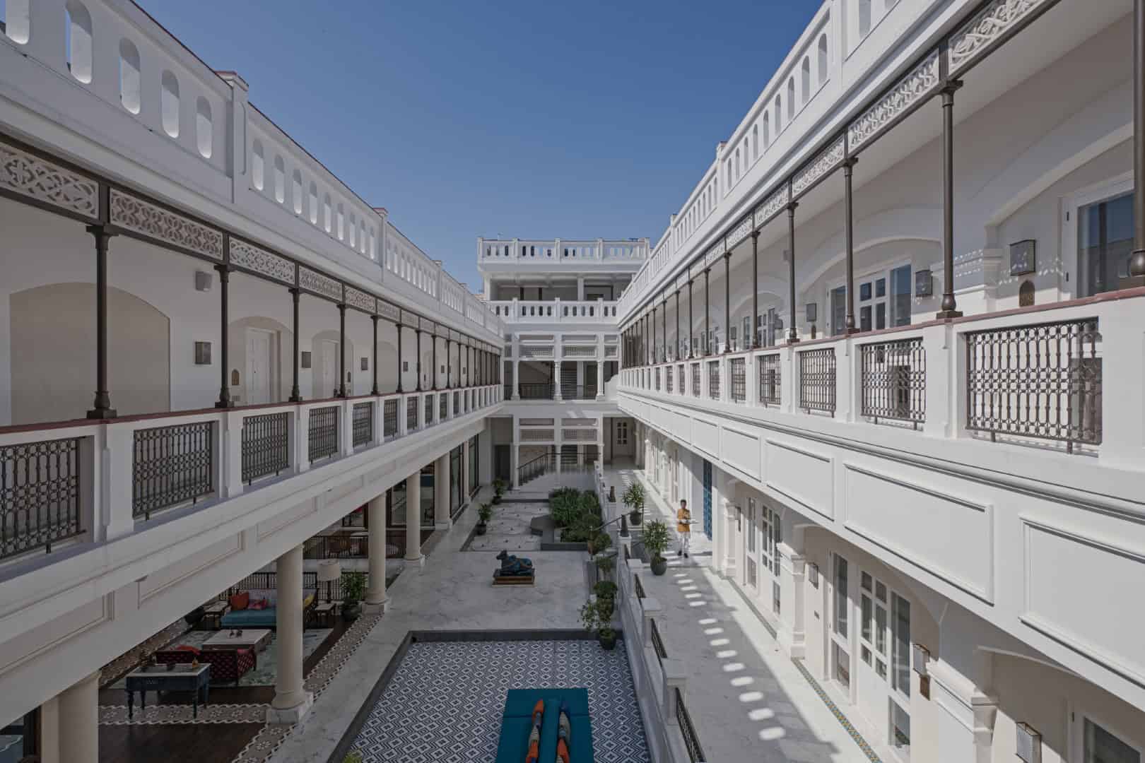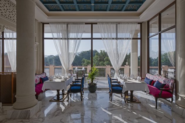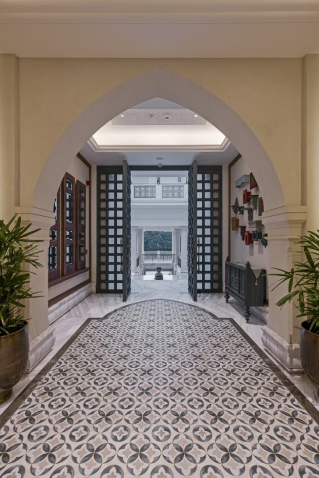 The hotel situated along the banks of the river Ganga was effectively divided into four sections: entry, courtyard, and lounge, and the dining are all leading toward the holy river. The entryway symbolizes Dharma. The large entry doorway is recreated to be exemplary of the original doors coated in antique blue of Neelkanth. The colours of Ganga and Neelkanth were instilled, reflecting through the doors and windows. The entryway ensured the guests could feel the energy between the two doors, where the ancient artefacts carry the memory and history of the haveli. The courtyard becomes the next space that guests enter emphasising the relationship to Artha. The courtyard provides an unobstructed view of the lounge and several rooms. Both the ceiling and flooring are adorned with intricate carvings. The view from this vestibule is unparalleled. The ripples of the coordinates can be seen in the design of the courtyard. The lounge is attached to the courtyard, which further leads to the holy river.