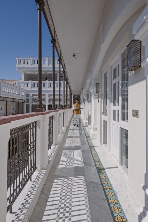The hotel is divided into three sections: entry, courtyard and lounge, eventually leading towards Ganga for people who come to this place to find peace and liberation. The design of the hotel is heavily influenced by a traditional Indian approach. Using the rich colours of Hindu temples, the design style is contemporized with Indian influences.