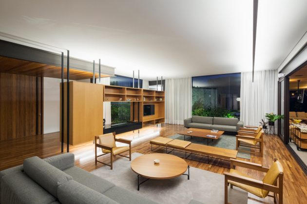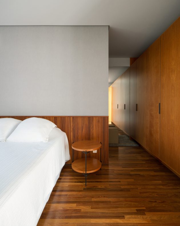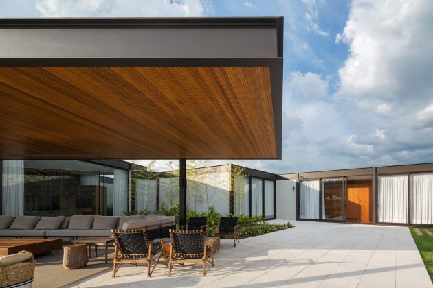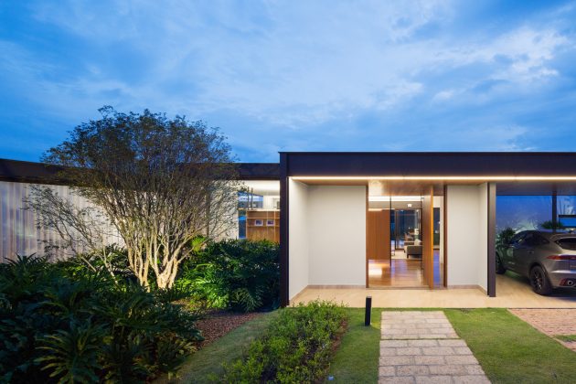 A key façade facing the street is composed of low horizontal volumes arranged in dialogue with the terrain. On the private side, the long bedroom wing is clad in a cumaru brise (muxarabî) that filters light and ensures privacy.