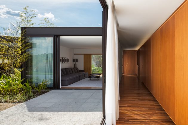 Pindaibeiras Residence, designed by Pablo Lanza Arquitetura in collaboration with André Scarpa and Rosário Pinho, sits gracefully on a generous plot in Itu, Brazil. Developed mostly on one level, the house takes advantage of panoramic views and sloping terrain to create a home that elegantly balances privacy, openness, and visual connection with its surroundings.