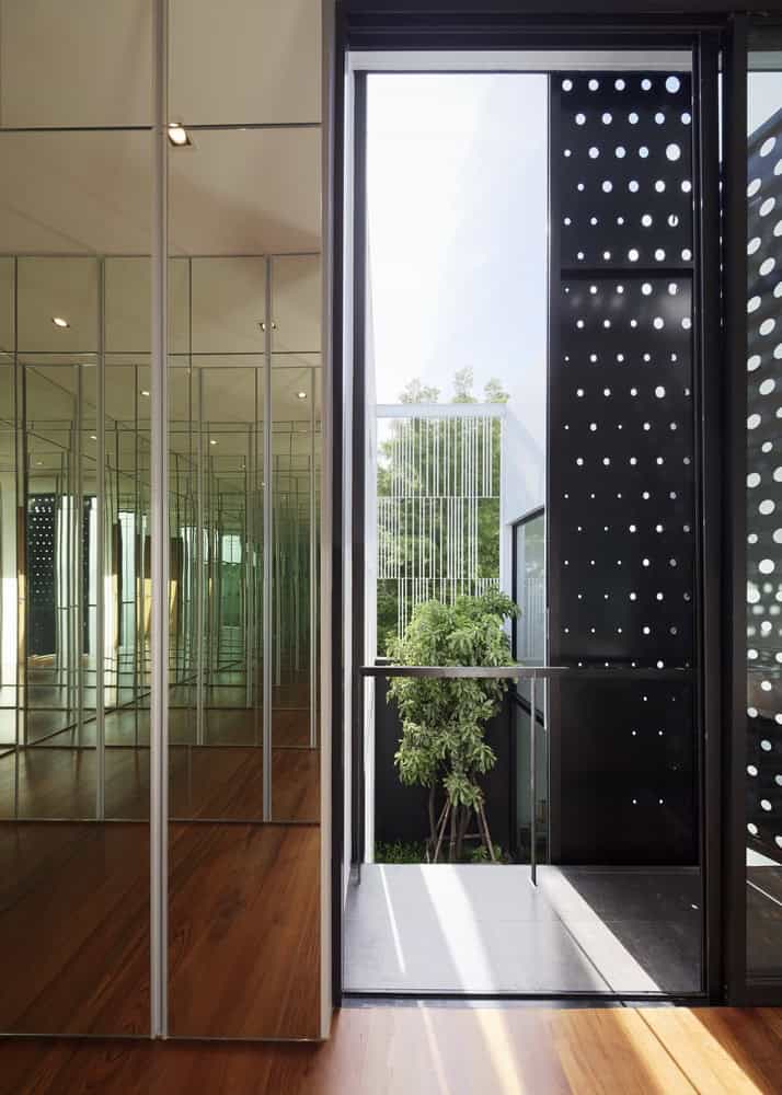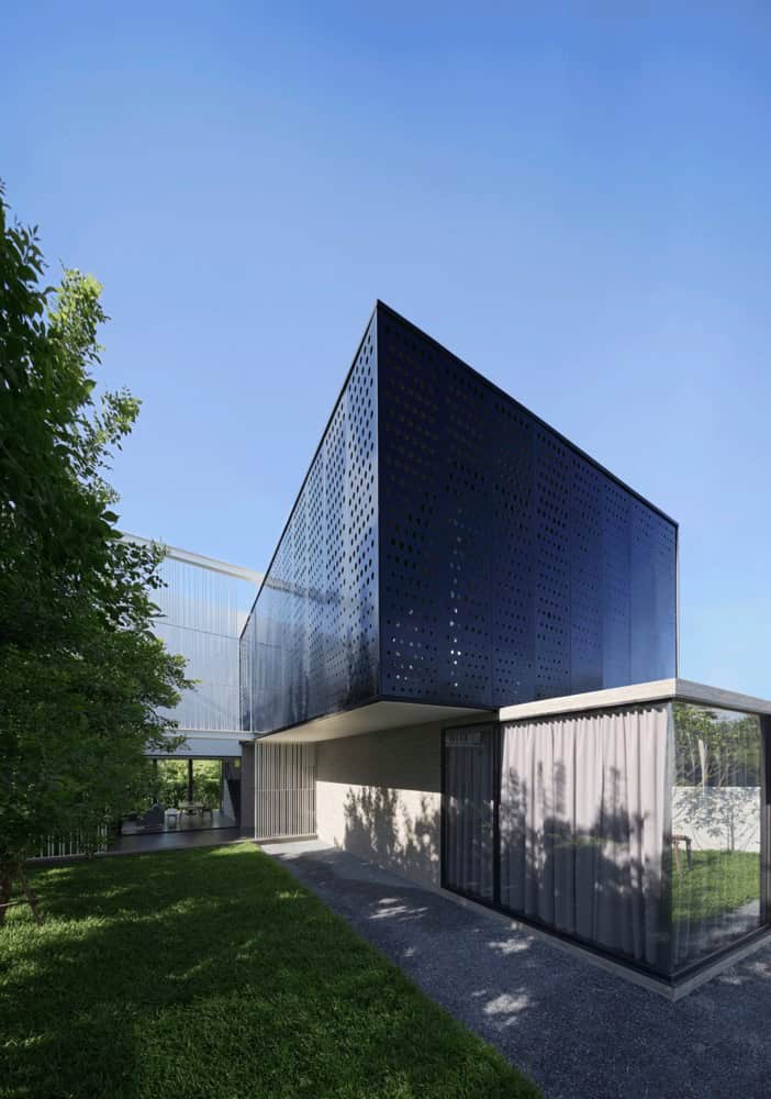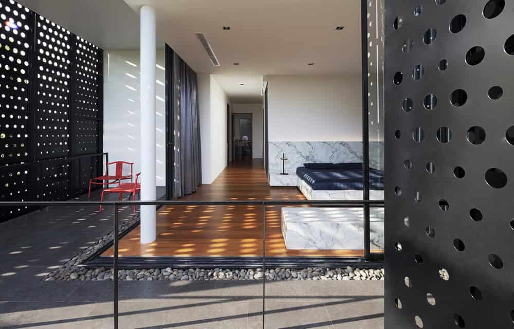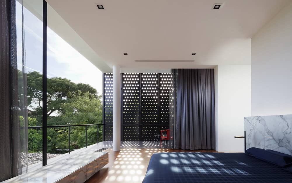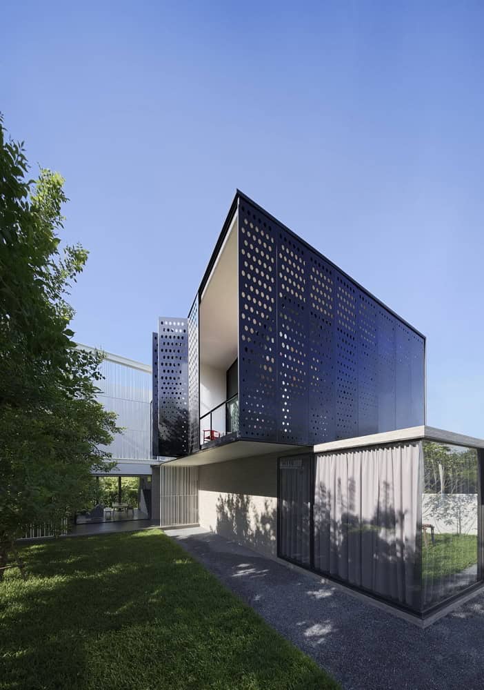 The nighttime area is on the higher floor, to provide privacy and safety. The main nighttime area or the masterbedroom, is designed as “THE BLACK safe box” by cladding the customized screen panels, of which some can open to make way for the windows behind them. The black protection screen is made from Metalic-dark perforated aluminum panel with the gradation of varying size holes and patterns, from small to bigger, vary to the function inside and level of privacy. These perforated aluminum panels are not only serve as architectural elements, but also help to block the ambient noise, and allow light and air to enter without sacrificing privacy. These folding panels are 100% ventilation and allow the user to take the panorama view of scenery when fully opened, or they can completely closed for privacy, sun-shade control and obtaining security. This Black box is an excellent concept for adding a visually stunning element to interiors and exteriors alike. The result is a constantly changing building facade, almost the feature sculpture.