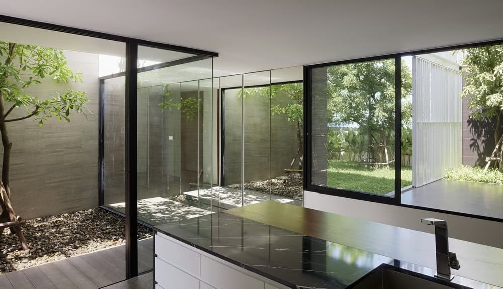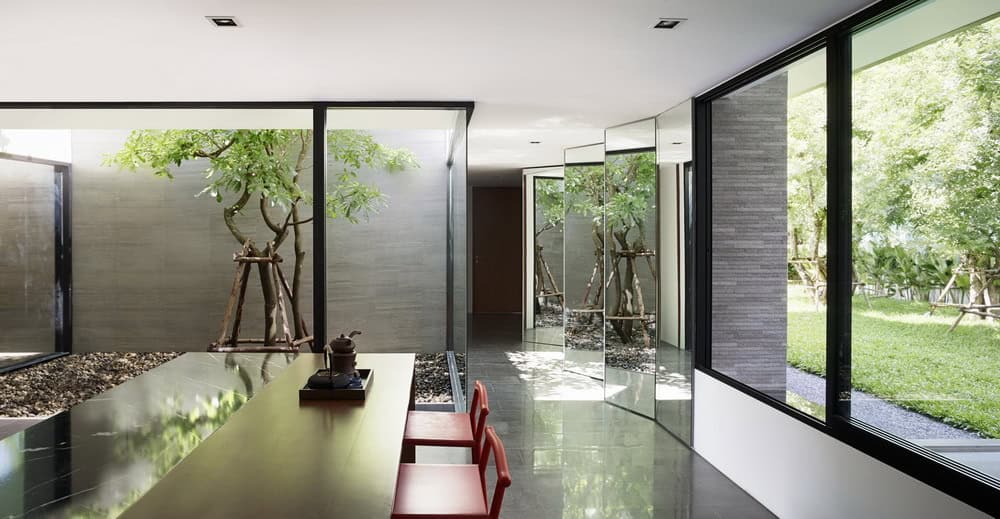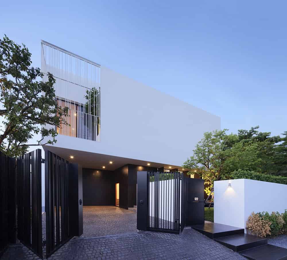 Apart from the security issue, The layout is designed in response to the tropical orientation. The significant function like master bedroom and working room, has the high ceiling for ventilation and slightly shifted a mass forward to create the cantilever balcony, this also functions as eaves for rain and sun protection to the mass below. These climate protection concepts are applied from the traditional trace of Thai architecture which is the most suitable for rain and tropical condition in Thailand and South East Asia. The house layout is also designed by taking advantage of big opposite green space behind the house. The big trees are placed along the boundary to block the unwanted view from the next door area. Landscape is designed minimally with a privacy concern as well as provide aesthetic aspect.