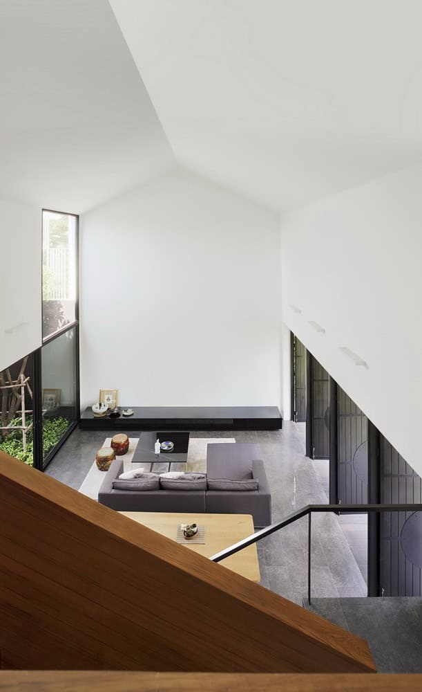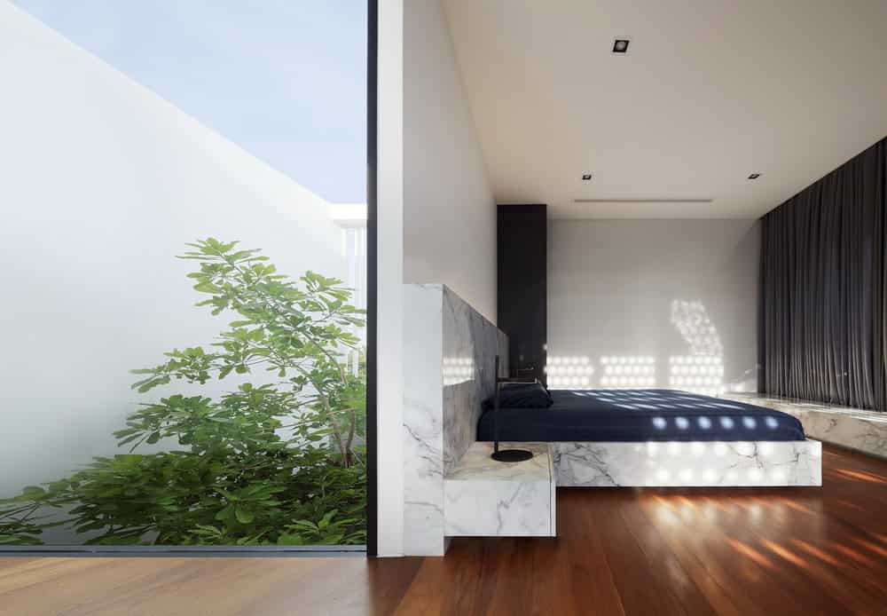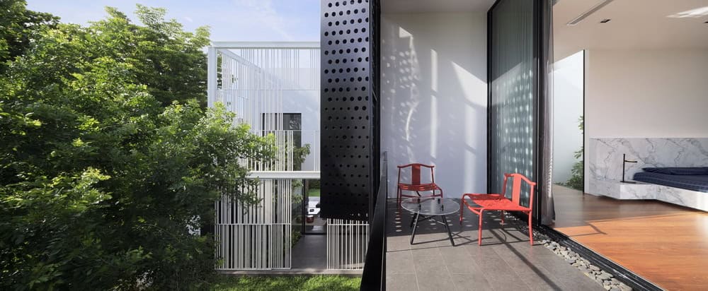 AAd also creates the program of this house by dividing the function between daytime area and nighttime area. The daytime area is on the lower floor, Living zones, with full connection to the outside and the garden. This area is designed as “THE WHITE box” with the solid white wall and the white vertical protection screen. These white aluminum extrusion strips are developed and applied from the normal obsolete security curve steel, to disappear and blend with the landscape outside. Most of living areas are directly connected to the garden with sliding partitions allow the air flow through into the double height space to reduce the heat for tropical climate. The location in the middle of two courtyards give rises to the people feel connected between inside and outside. The service function is divided by a kitchen which located in a place where it can serve people in living area and all zones. The guest bedroom behind has been defined by pocket courtyard to increase more privacy, and provide dramatic spatial quality for corridor in the middle.