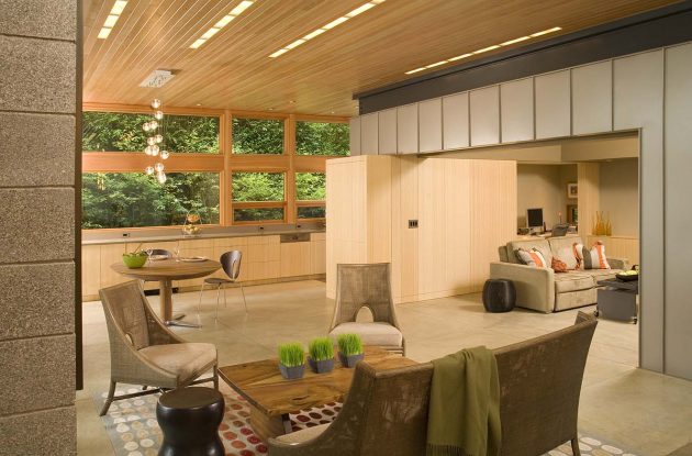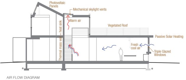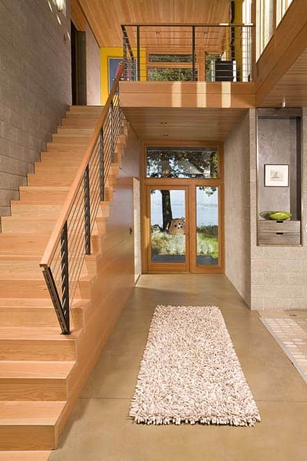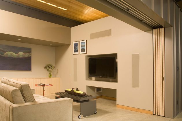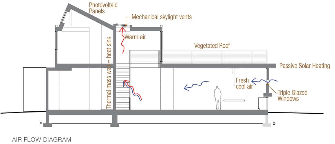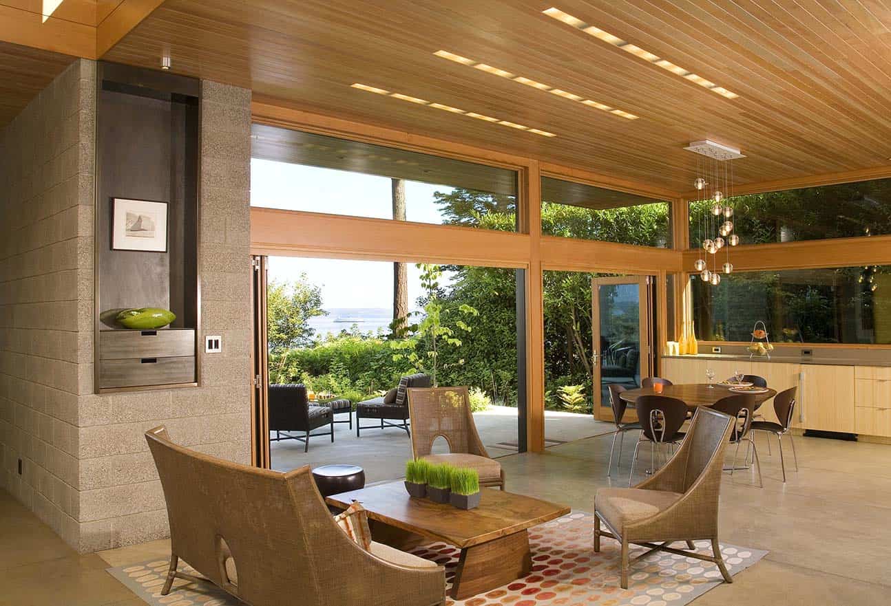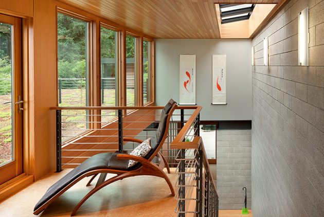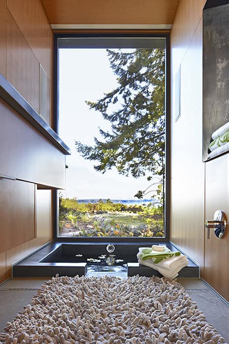 The entire house is oriented to capture sunlight and shade and designed to passively heat and cool itself. The home has a wide range of features aimed at increasing energy productivity and collecting rainwater, all while reducing the amount of energy used. A large “spine” running east to west forms a central thermal mass core for the house. This massive wall reduces temperature swings from day to night and is oriented in conjunction with operable skylights to take advantage of cooling techniques. This wall also acts as a boundary between private and public spaces. To the north, the private portion of the house is more enclosed. To the south, the glass-filled public spaces have abundant natural light and views. To the east, the side of the house that faces the water, the windows and doors open to allow natural, cool breezes from the Puget Sound to ventilate the interior spaces.