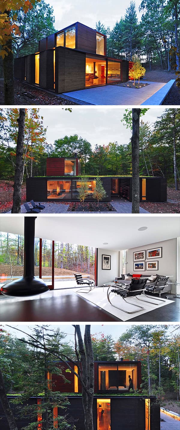 The Pleated House, designed by Johnsen Schmaling Architects, is a contemporary retreat for a couple seeking refuge in the natural beauty of Door County, Wisconsin, a narrow peninsula on Lake Michigan. Tucked into a dense forest of deciduous and coniferous trees, the 1,855-square-foot residence dissolves into the wooded landscape with a modest form and a material palette deeply connected to its environment.