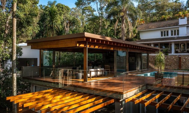 The covered area is a large wooden pavilion made of eucalyptus GLULAM, which accommodates a full kitchen, dining area, living room, and dressing room. The pavilion is supported by two main beams, and the floor coverings are made of demolition wood and “cumaru” wood deck in the solarium around the pool. Large glazed sliding panels create a seamless connection with the outdoors. The lighting design is carefully planned with indirect linear lighting installed around the entire perimeter, over the wooden beams. The spacious design, combined with the use of natural materials, creates a visually light and discreet construction that blends well into the surrounding landscape.
