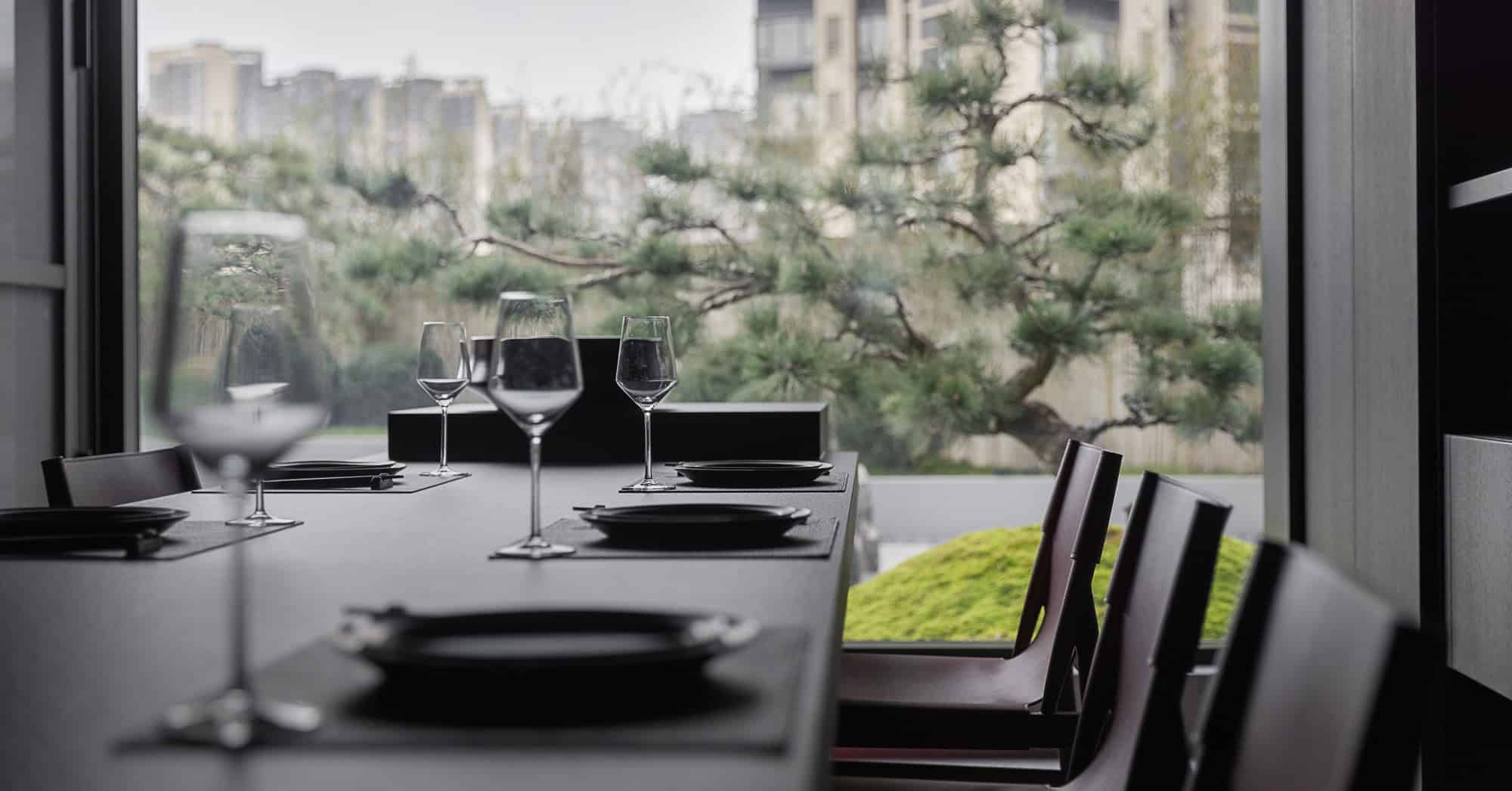 From the entrance vestibule to the central tearoom, the design uses dark materials, framed vistas, and tranquil furnishings to heighten the sensory experience.