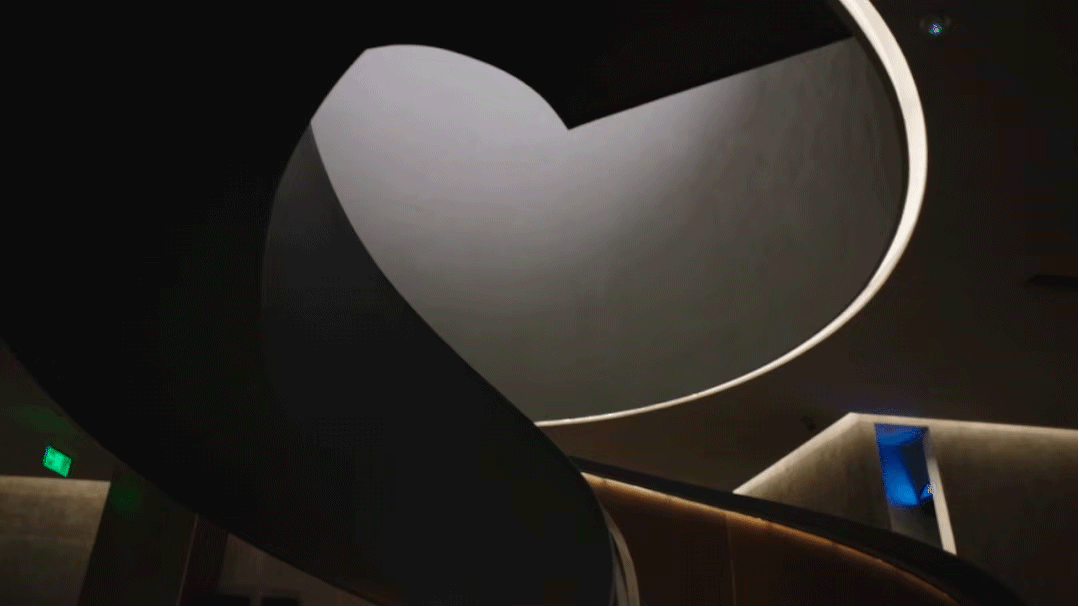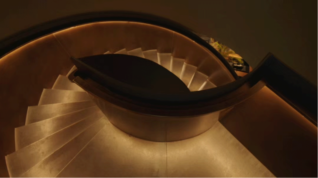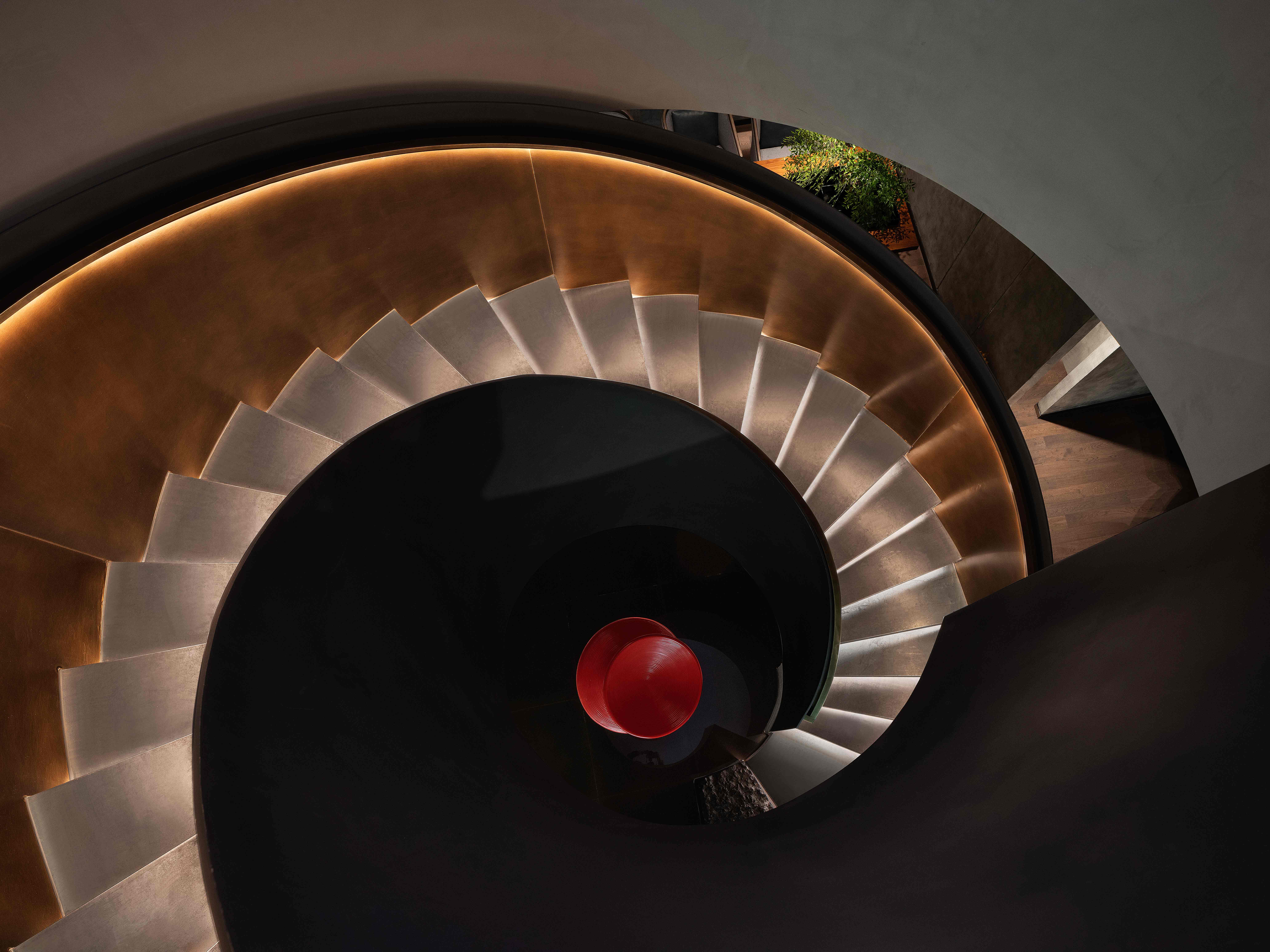 The spiral staircase, painted in textured copper and accented with artworks, rises like a sculptural centerpiece. With each step, guests encounter shifting perspectives, echoing the project’s theme of layered experience.