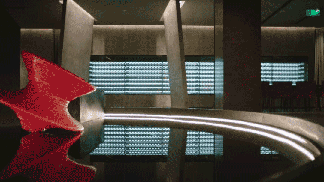 Inside, the atmosphere transforms constantly—light and darkness, virtual and real—depending on time of day and vantage point. Floor-to-ceiling windows invite the park’s greenery into the restaurant, erasing the boundary between architecture and nature.