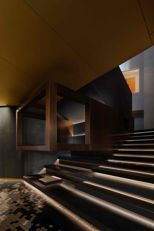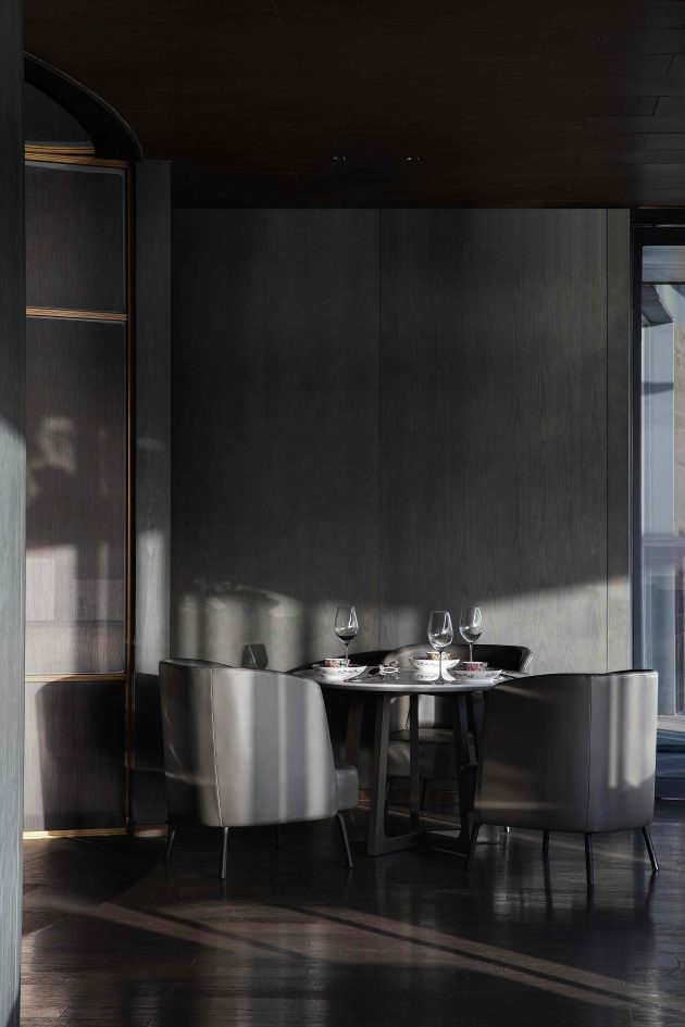Elsewhere, asymmetry defines the spatial order, blurring traditional Chinese references with Western modernity. Every surface, from the copper-toned spiral staircase to the walls adorned with curated artworks, enriches the tactile experience.