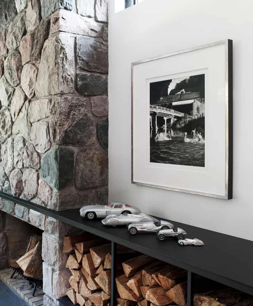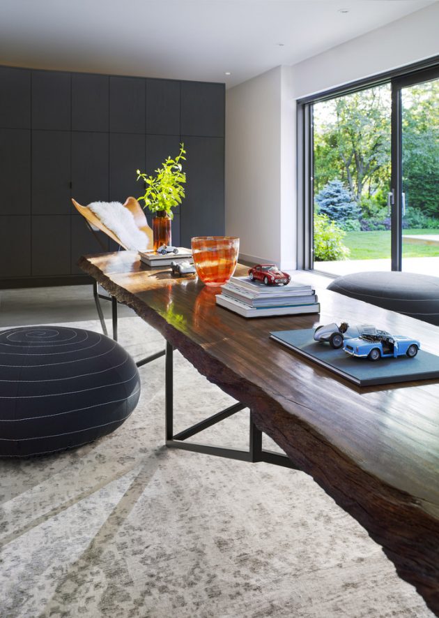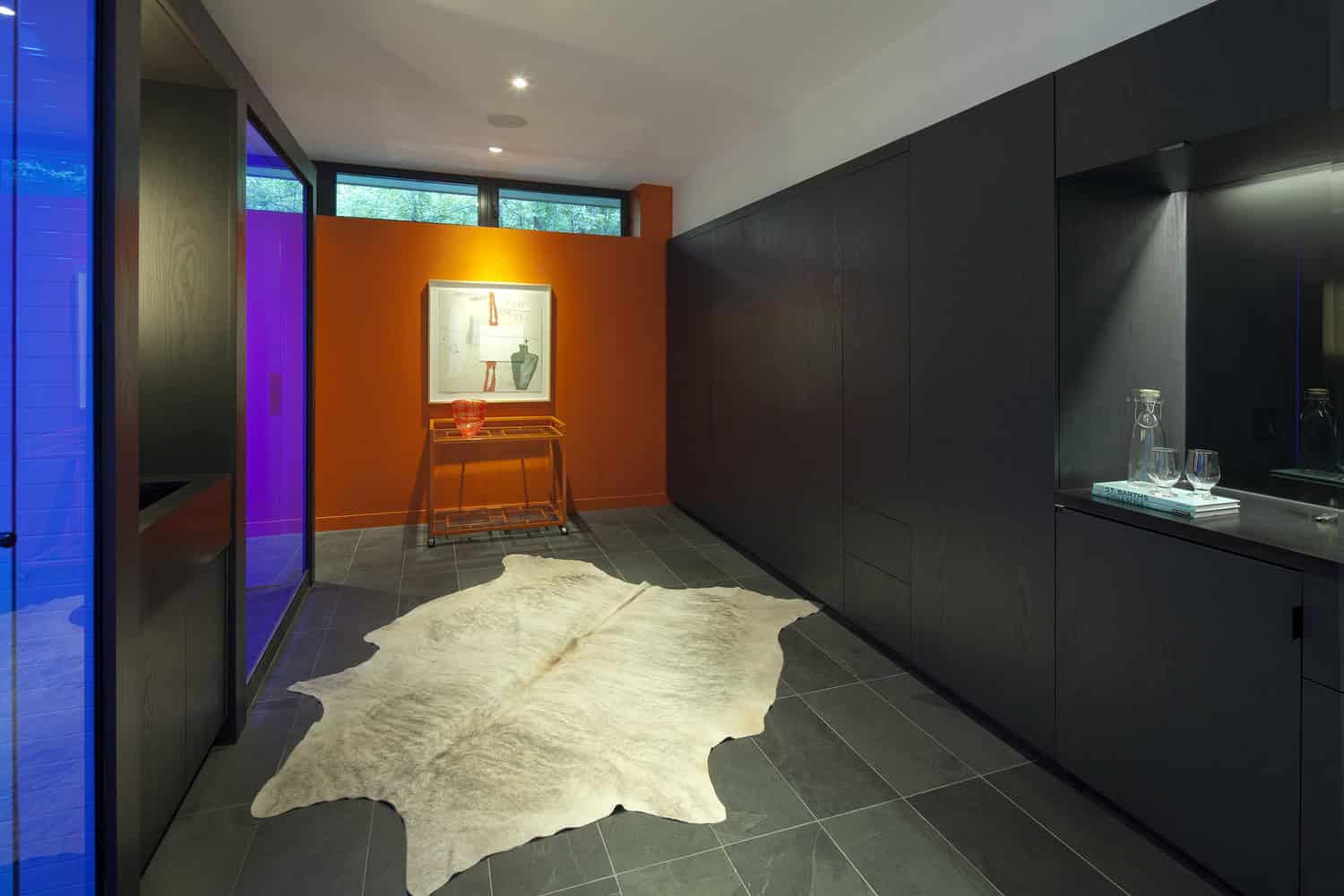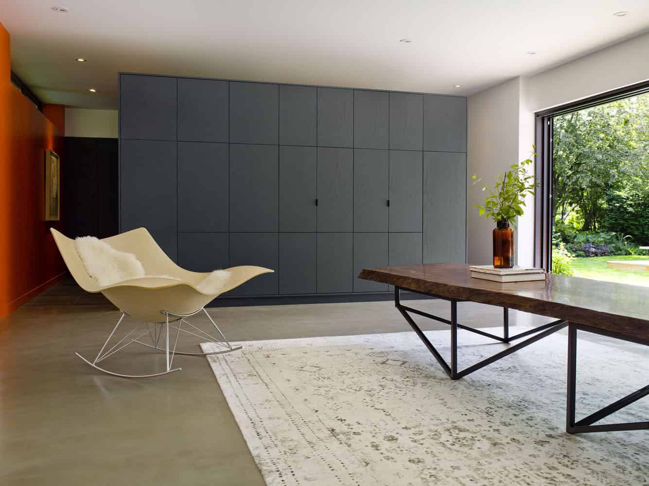 On the public side, the black millwork holds IT and audio visual entertainment equipment. The large table, designed by Tong, is made of exotic wood salvaged from the Panama Canal and features a geometric steel-frame base. The scale of the table, 14’ x 3’ is long and luxurious. The coffee table can be easily raised to counter height by rotating the legs, transforming the space from an intimate family space to a space for larger events such as dinner parties or a work studio. The bright orange feature wall, which transcends both the private and public spaces, is used as a gallery wall for the client’s art collection.