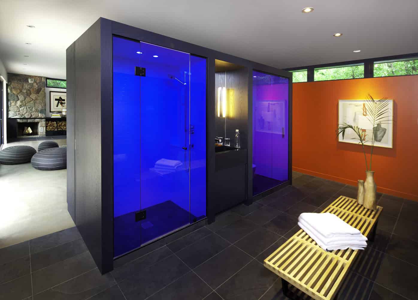 Tong’s experience designing luxury guest suites and multifunctional spaces for hotel projects like the W Hotel in New Jersey and the Drake Hotel in Toronto informs his approach to the interior. Moving inside, the environment is designed to act as a pool house for guests changing and showering, as well as a guest suite for extended stays. The open-concept room is punctuated by a large, freestanding monolith that defines the private and public space.