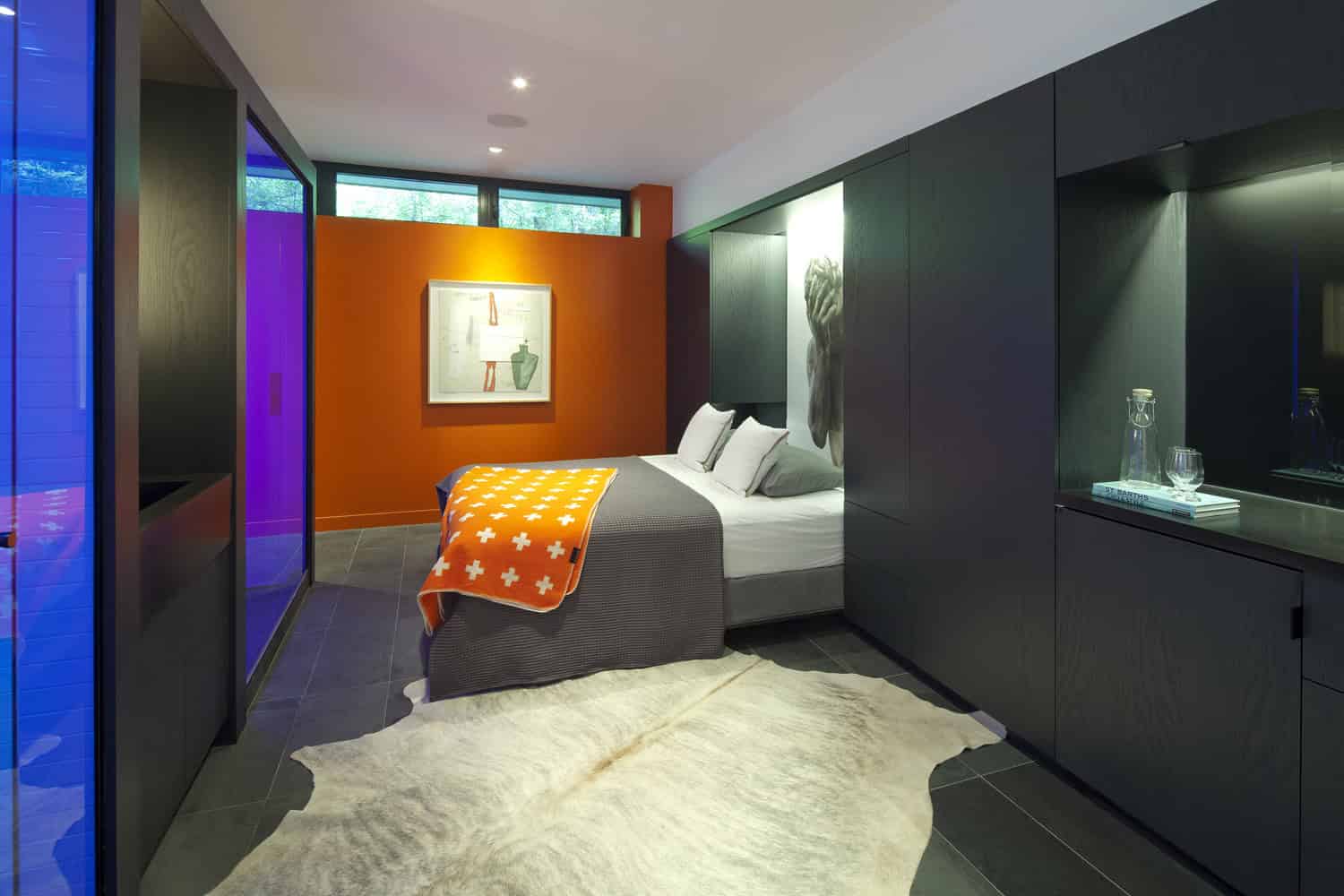 On the other side of the monolith is a shower and toilet, both of which are enclosed with vibrant blue glass. “Like a lot of our work, we try to add playful elements, elements of surprise” says Tong. The opposing wall features a custom Murphy bed with integrated side tables and full support for luggage and storage. A built in microwave, mini-bar and coffee machine are all provided with the vision of giving guests the hotel experience complete with a complimentary munchie box.