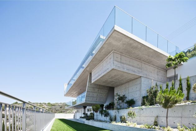 Looking at the residence from below, the form seems even more dramatic thanks to the extensive use of fair-face concrete. Large concrete building volumes appear to float from the hill side, creating an unexpected composition that appears to defy gravity.