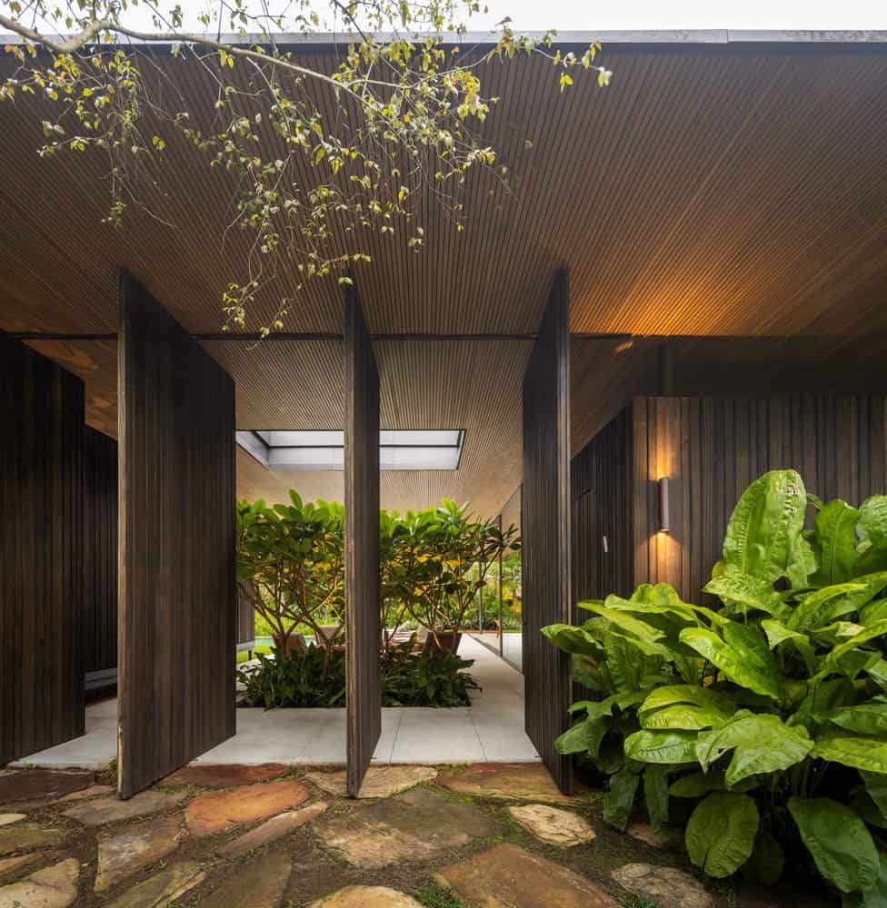 The pergola over the entry sequence acts as a transitional filter—light, shadow, and texture modulate arrival. Within, a reflecting water feature extends through the core, weaving gardens and interiors into a unified spatial experience.