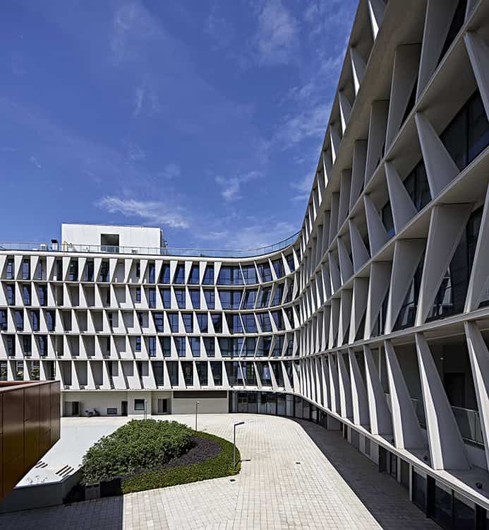 The rhythm of light and shadow across the façades gives the structure a distinct, sculptural identity that changes throughout the day, symbolizing the project’s ethos of urban transformation through design precision.