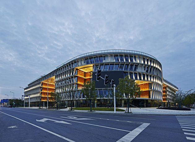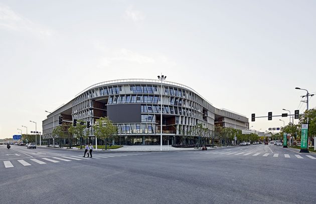 The site’s canal-side setting plays a vital ecological role. BAU’s design extends the canal’s edge into a green pedestrian corridor, connecting the building to a larger network of public spaces across Pukou.