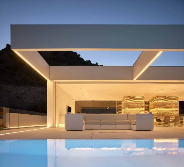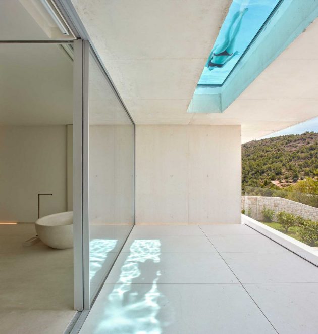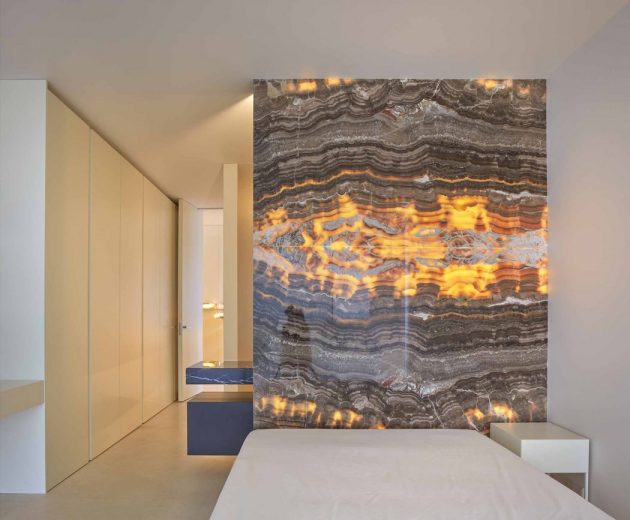 The Quarry House is characterized by a bold use of in situ white concrete, emphasized by its raw structural expressiveness. In contrast, the interiors are warmed by exquisite detailing, most notably a central staircase clad in yellow onyx Neve D’or. This backlit natural stone glows like a sculptural core, visually stitching the house from top to bottom.