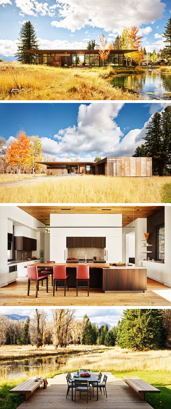 Set between two spring creeks within a wildlife-rich ecosystem, the pavilion serves as a two-bedroom guesthouse and retreat for the owners, now empty nesters. The design replaces an older structure on the same footprint, requiring a careful two-year planning process with Teton County to address setbacks, waterways, and wildlife preservation.