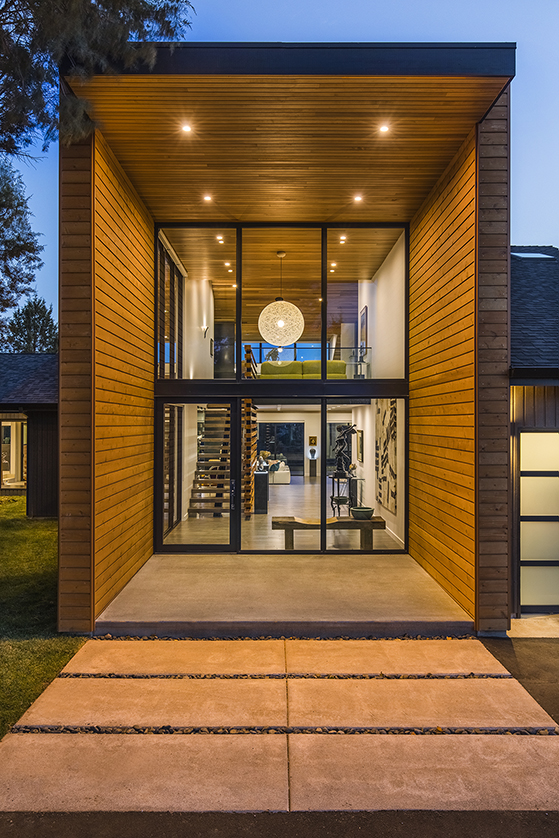 Glass walls open up the south facade to allow light deep into the space while maximizing views of the canyon below, and a minimalist interior allows the couple’s extensive art collection to be showcased throughout the home. Dark vertical siding blends with the natural landscape while knotty, horizontal, cedar planks provide a bold but natural accent to the exterior facade.