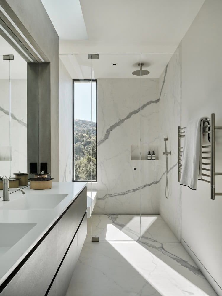 Inside, finishes are minimalist, allowing architectural form and surrounding nature to take center stage. From the public roof deck, visitors can soak in the rare northern views toward the Bay—an important feature for the homeowners, who wanted shared access without compromising the privacy of their primary suite.