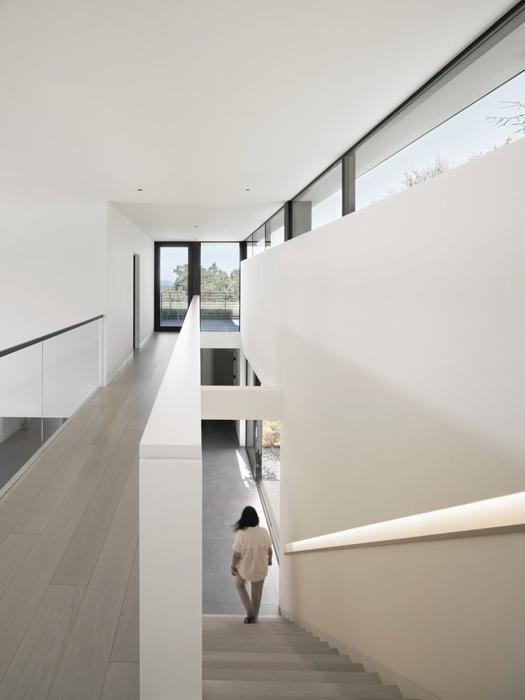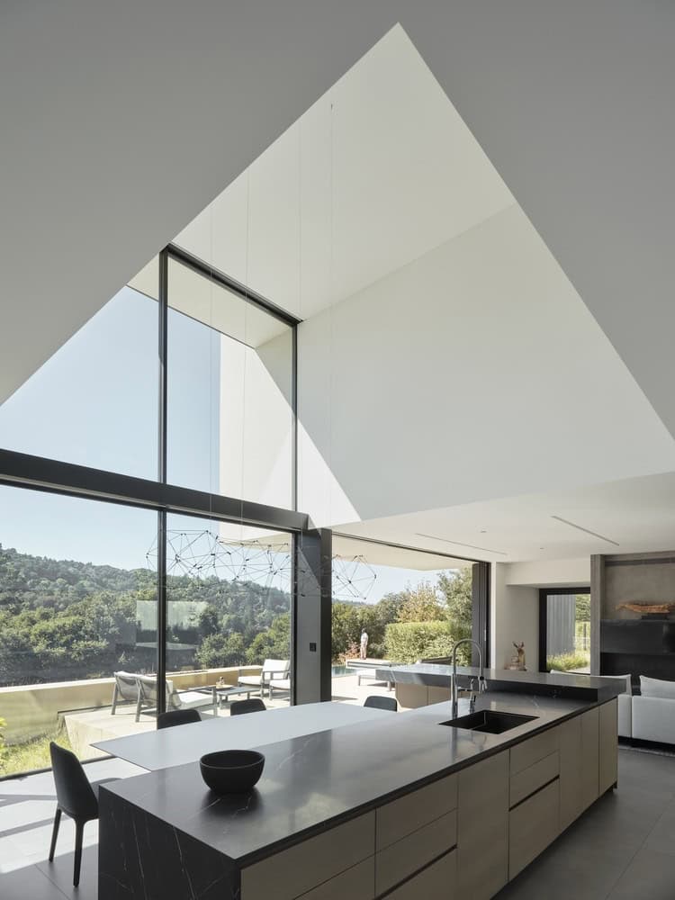 The perpendicular wing, a single-story mass topped with a green roof, offers a multipurpose space adjacent to the pool terrace—ideal for exercise, play, and entertaining. A sleek infinity pool dissolves the line between cultivated landscape and native meadow, reinforcing the architectural emphasis on seamless transitions.