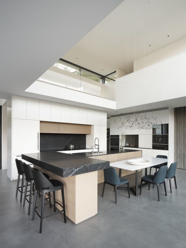 A double-height volume defines the kitchen and dining area, establishing vertical connections to a loft study and upper-level bedrooms. Clerestory windows and light wells usher in morning sun, while ensuring privacy and maintaining a close dialogue with nature.