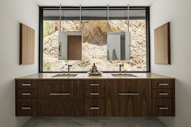 On the interior a fairly neutral palette of walnut and white cabinetry with quartz counters and marble tile were used throughout to keep the red rocks as the star material.–The Ranch Mine