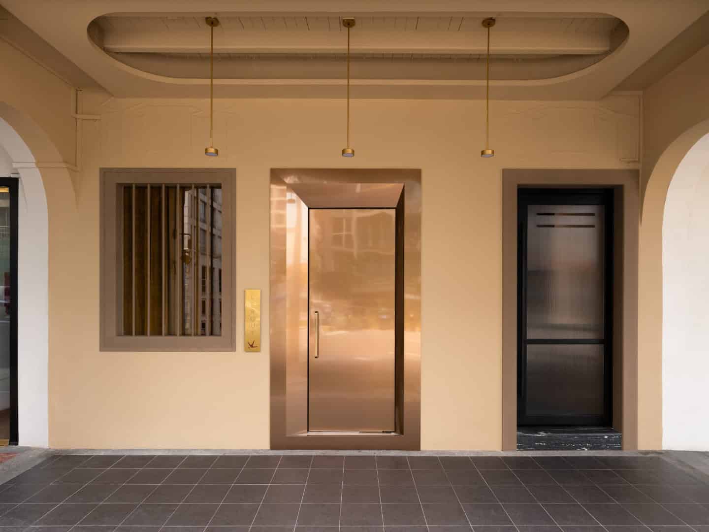 Mirrored bronze elements visually expand the narrow shophouse layout.