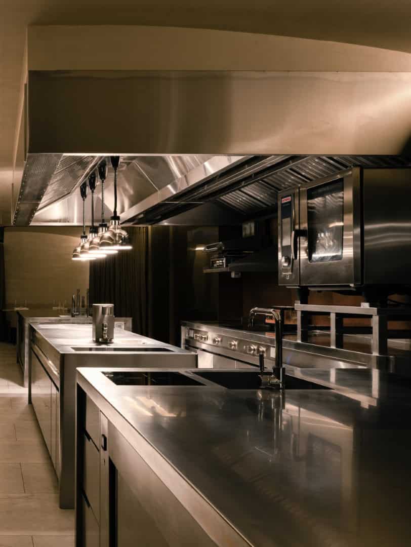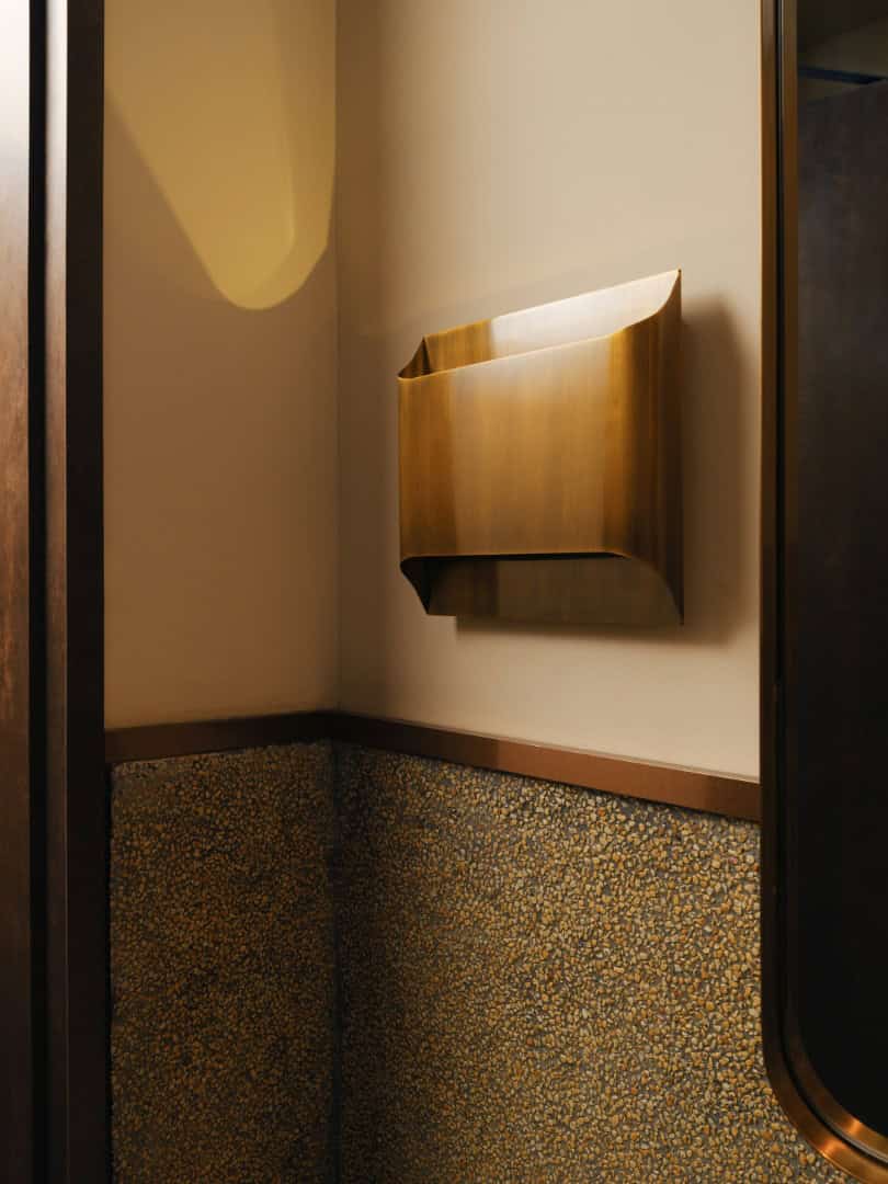 At the far end of the restaurant are the wine cellar, restrooms, and technical kitchen, each designed with continuity in mind. Warm beige tones, pebble-textured walls, and bronze metallic details echo the main dining room.