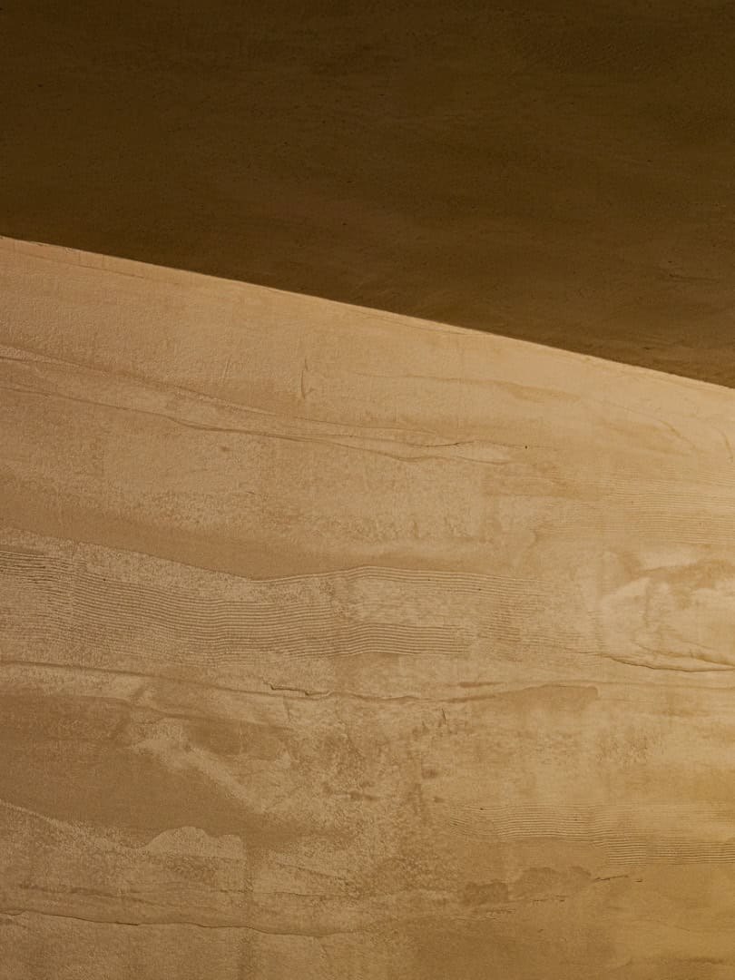 Travertine plaster ceilings enhance acoustics and visual continuity.